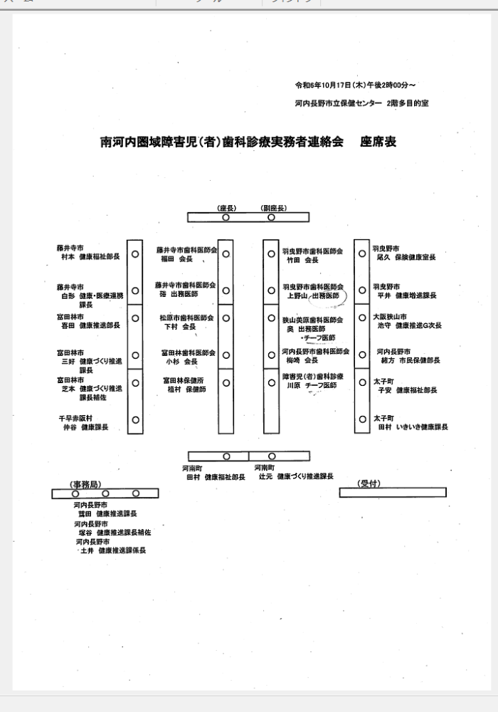 令和6年10月17日(木)午後2時00分から、実務者連絡会に参加してきました。8市町村、6歯科医師会、保健所、健康推進課などからの参加者です。私はチーフ歯科医師という立場で参加しました。