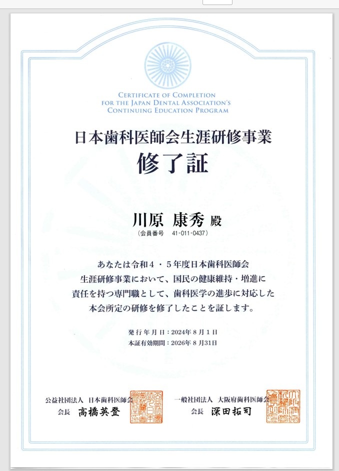 先週、日本歯科医師会から生涯研修事業修了証が届きました。あまり気にしていませんでしたが、学会や研修会に結構参加してたみたいですね。