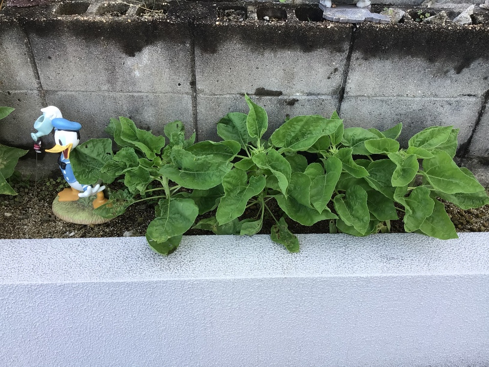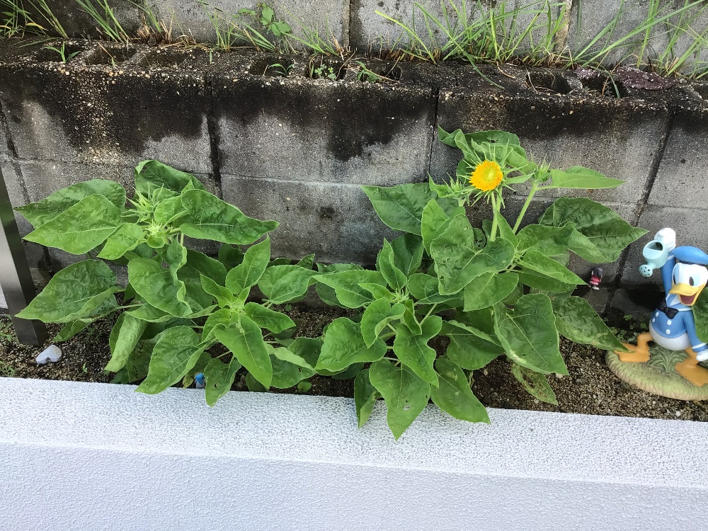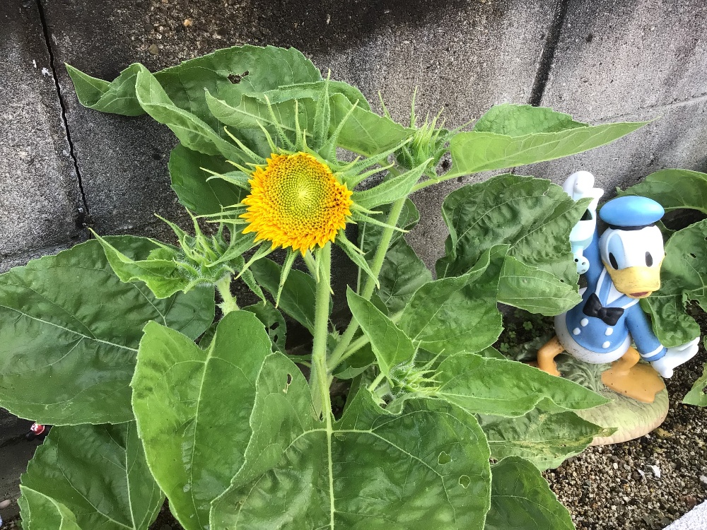 水曜日ひまわりの一本の株が花を付けました。今日来てみるとしっかり咲いていました。