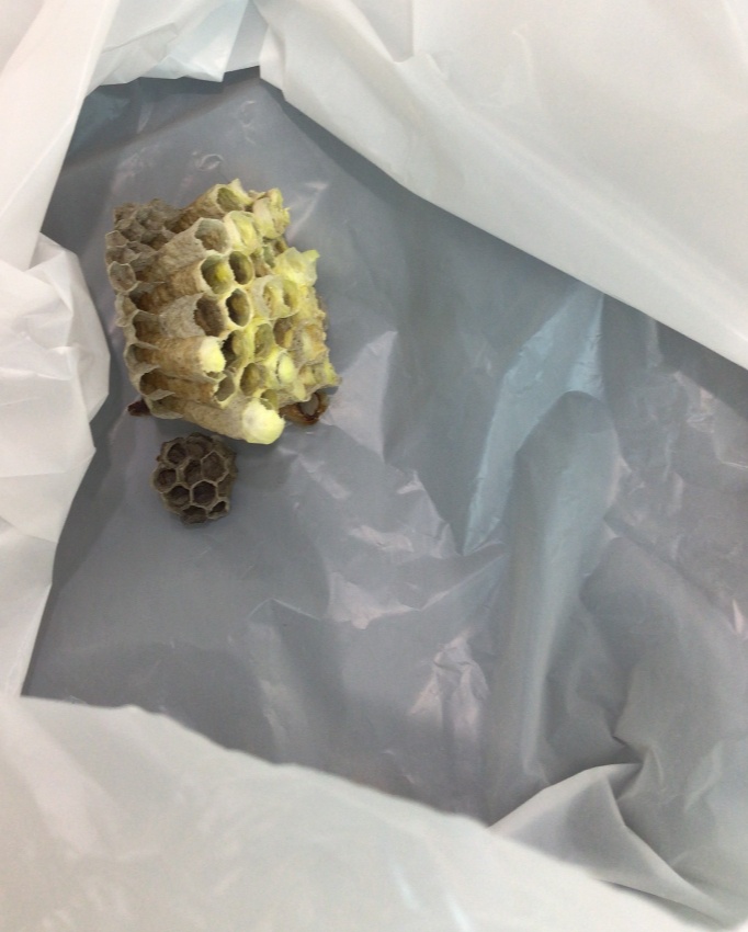 先週出勤してきたスタッフが「裏にハチの巣があるみたいですよ」と言ってきた。 診療所の裏の方が教えてくれたそうです。 確認したところ5センチほどの巣と、よく見ると2センチほどの巣2個見つかりました。 数匹の蜂が飛んでいるのも確認できたので、蜂用のスプレーを買ってきて駆除することができました。 感謝です。有難うございました。
